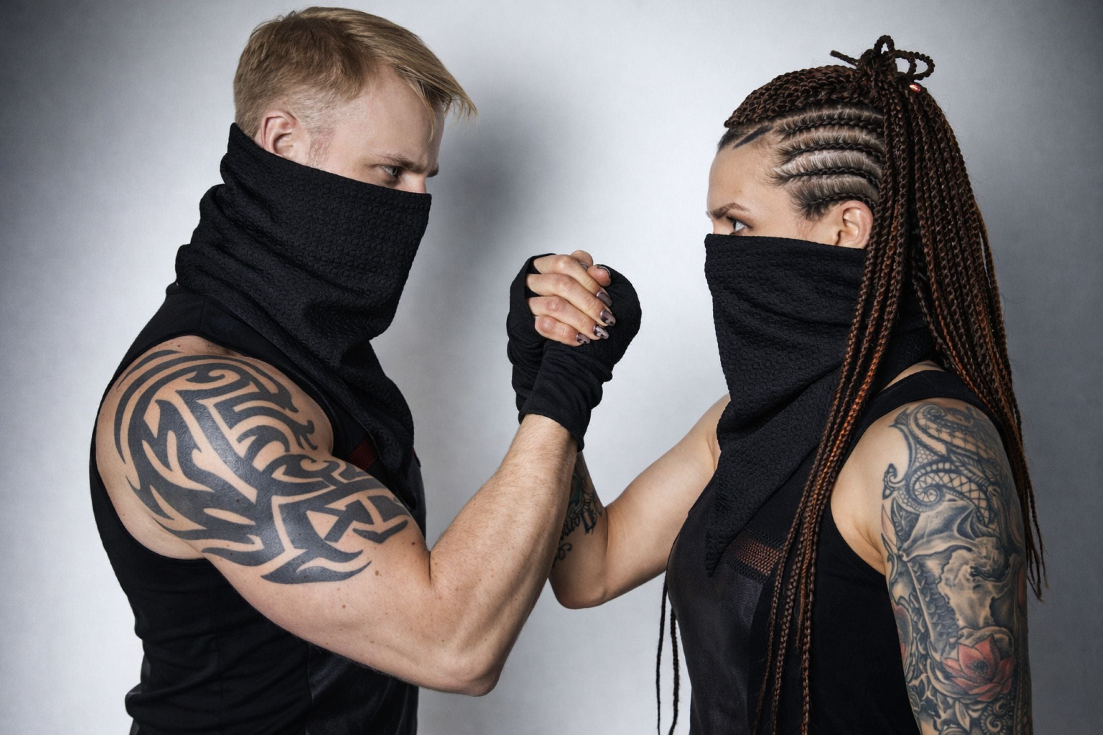 Black infinity scarf face cover on female model with braided hair, textured jersey snood with geometric tag, cyberpunk techwear styling, neutral studio backgroundBlack infinity scarf worn as face cover, textured jersey snood with tag detail, styled with fitted long sleeve techwear top on male model, minimal studio backgroundÉcharpe infinie noire SC2 Q8Écharpe infinie noire SC2 Q8Black face cover infinity scarf pulled up over nose, textured stretch snood with structured drape, techwear styling on male model, clean light backgroundÉcharpe infinie noire SC2 Q8Écharpe infinie noire SC2 Q8
