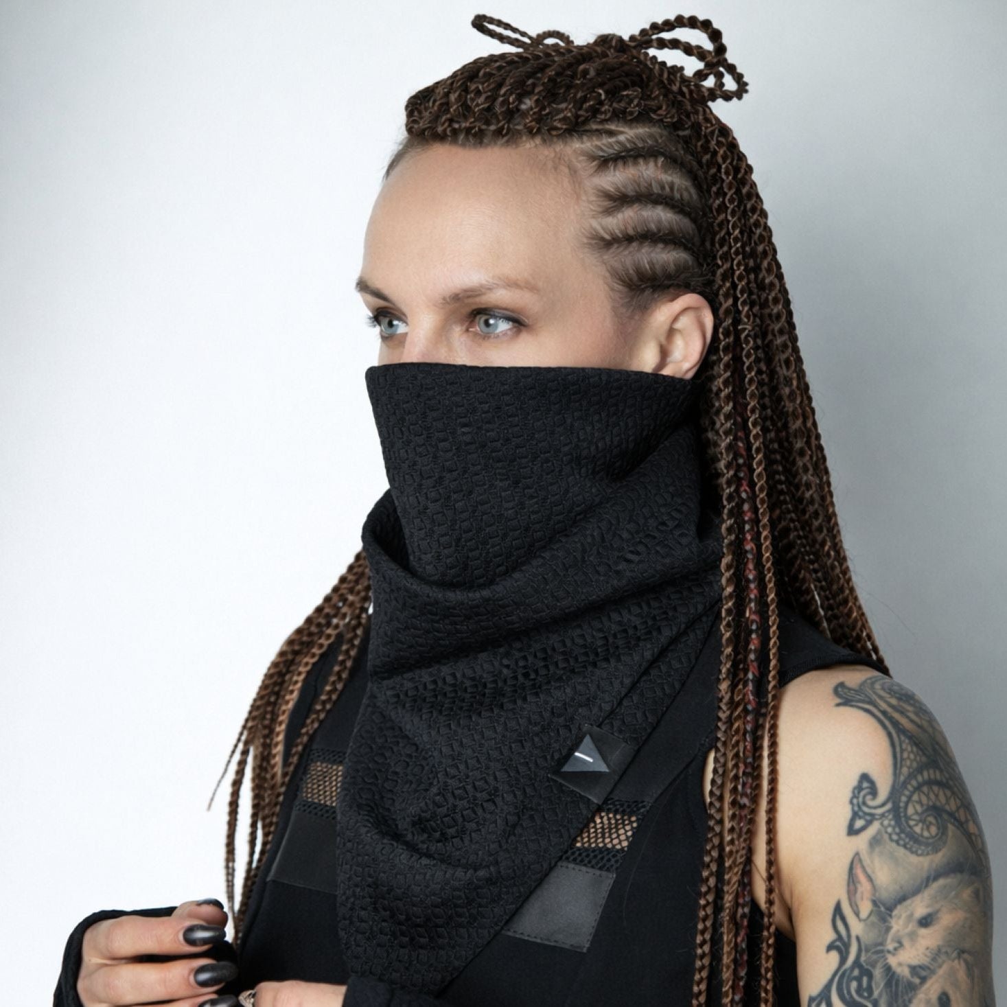 Black infinity scarf face cover on female model with braided hair, textured jersey snood with geometric tag, cyberpunk techwear styling, neutral studio background