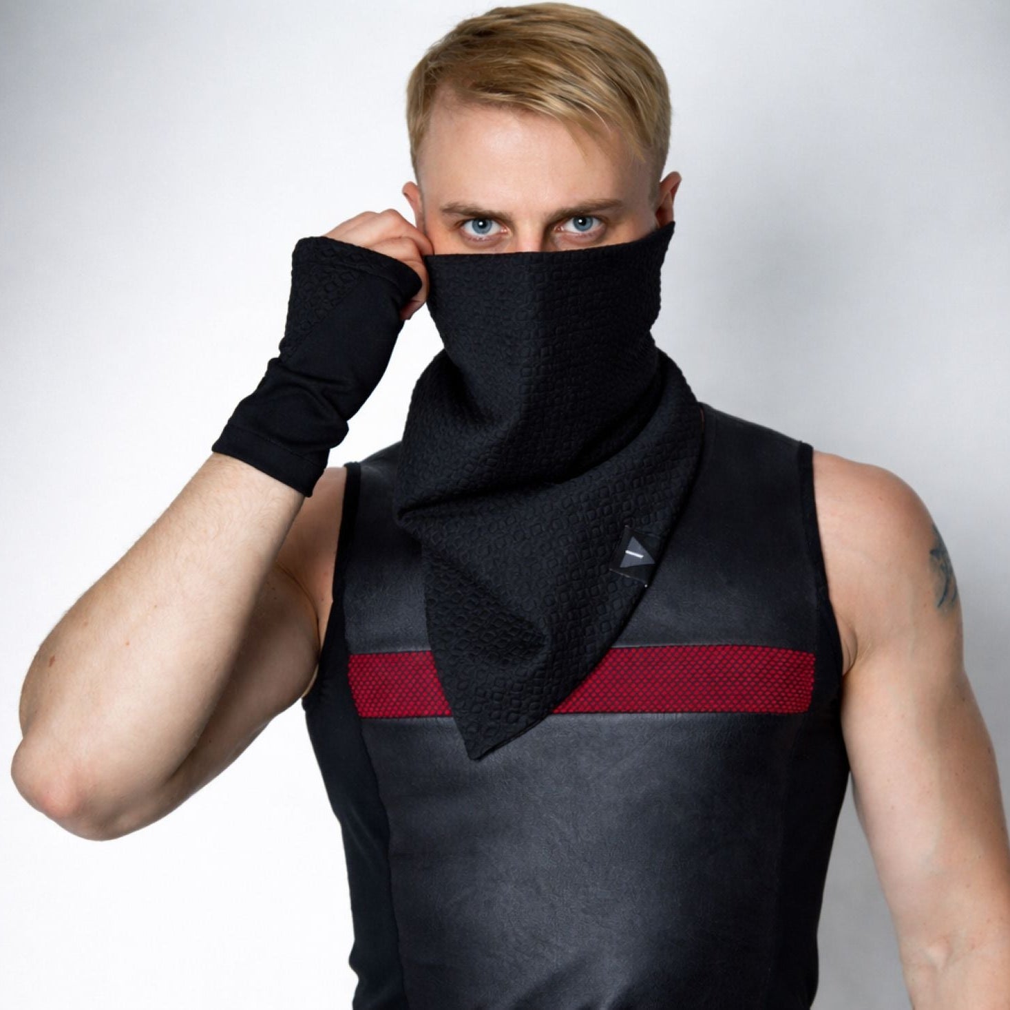 Black infinity scarf worn as face cover, textured jersey snood with tag detail, styled with fitted long sleeve techwear top on male model, minimal studio background