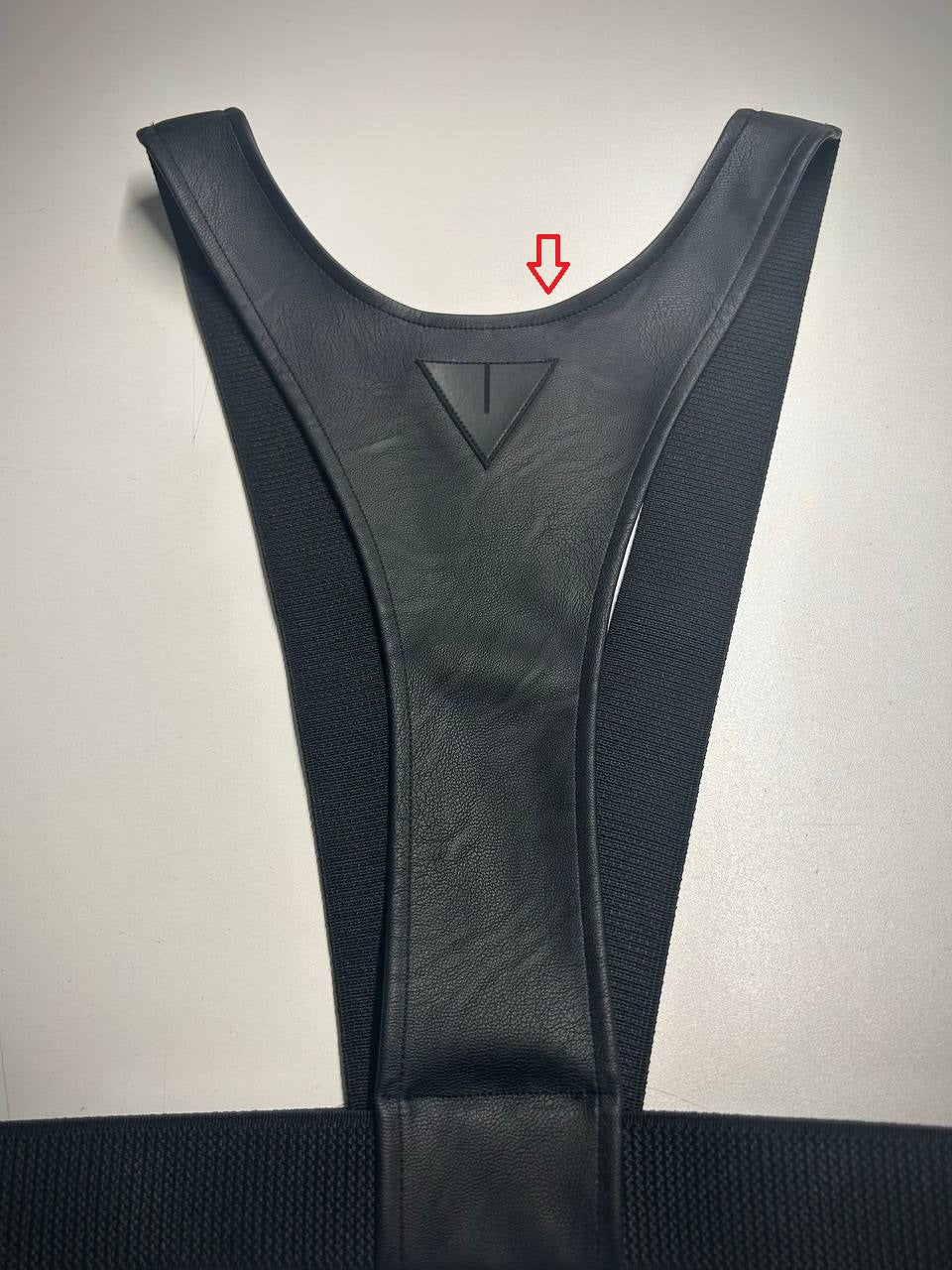 Black eco leather bust harness made of faux leather that holds with the elastics on the back. It's made of semi-thick leather. The edges are finished with bias tape that is neatly hemmed.