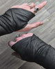 Leather arm warmers with an uneven hem made of faux leather. The fabric contains a little elastane that helps it to keep its shape. These gloves are unisex and can be worn by anyone.